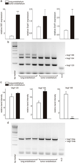 Differential expression of Wt1, Srpk1, and Srsf1, and Vegf splicing in tumor versus normal lung endothelium. (a) Quantitative RT-PCR analysis of Wt1, Srpk1, and Srsf1 expression in isolated tumor versus lung endothelial cells (n = 3 each). (b) Detection of Vegf isoforms (n = 3) was performed by RT-PCR followed by agarose gel electrophoresis as described [18]. A representative example is shown. The different molecular weight isoforms are indicated (Vegf 188: 293 bp; Vegf 164: 221 bp; Vegf 120: 89 bp). (c) Quantification of the different Vegf isoforms in isolated tumor and lung endothelial cells. (d) Detection of the Vegf 164a (281 bp) and Vegf 164b (215 bp) isoforms was performed by RT-PCR followed by agarose gel electrophoresis as reported previously [26] (n = 3). Data are expressed as means ± S.E.M. * p < 0.05, ** p < 0.01, *** p < 0.001.
