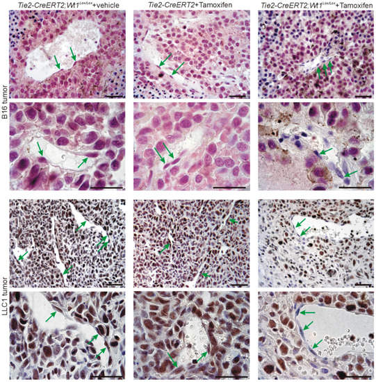 As it has been described that Wt1 regulates Srpk1 [19] and Srpk1 phosphorylates Srsf1, which results in nuclear import of the protein [30,31], we were interested in deciphering the role of Wt1 for the high nuclear Srsf1 expression in tumor endothelial cells. For this purpose, we used Tie2-CreERT2 mice crossed with Wt1Lox/Lox animals as reported before [22], induced vessel-specific knockout of Wt1 by Tamoxifen injection, and implanted syngenic B16 melanoma or LLC1 lung cancer cells subcutaneously. Tie2-CreERT2; Wt1Lox/Lox animals injected with vehicle (sunflower oil) and Tie2-CreERT2 transgenic animals injected with Tamoxifen before tumor cell implantation served as controls. Tumor samples were collected before complete regression occurs in this model [22] and analyzed for Srsf1 expression by immunohistochemistry. Comparable to human tumors, significant nuclear Srsf1 expression was detected in tumor and endothelial cells in control animals (Figure 3, left and middle), but Srsf1 was barely detectable in endothelial cells of tumors from Tie2-CreERT2; Wt1Lox/Lox animals injected with Tamoxifen (green arrows in Figure 3, right). Expression of Srsf1 in B16 melanoma cells and LLC1 lung tumor cells was unaffected by vessel-specific knockout of Wt1. The overall aspect of reduced immunoreactivity for Srsf1 in tumors of Tie2-CreERT2; Wt1Lox/Lox + Tamoxifen animals compared to controls might be attributed to increased lymphocyte infiltration, necrosis, and larger fibrotic areas with reduced number of tumor cells as reported recently [22].