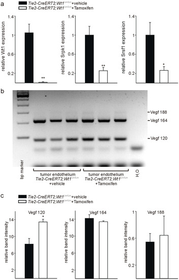 In addition, Srpk1 and Srsf1 RNA expression was lower in endothelial cells from tumors of Tie2-CreERT2; Wt1Lox/Lox mice injected with Tamoxifen compared to controls (Figure 4a). Next, we determined Vegf isoform expression in endothelial cells from tumors of Tie2-CreERT2; Wt1Lox/Lox mice injected with Tamoxifen compared to vehicle-treated controls by PCR as described [18]. The Vegf 188 isoform was barely detectable, while the Vegf 164 and Vegf 120 represented the major isoforms expressed in endothelial cells (Figure 4b,c). This is in agreement with the results presented in Figure 1. Knockout of Wt1 in endothelial cells in the tumors did not significantly affect the Vegf 188 and Vegf 164 isoforms, but induced a relative increase in the Vegf 120 isoform (Figure 4c). No significant differences were observed for the Vegf 164a and Vegf 164b isoforms (data not shown).
