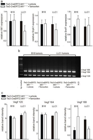 To investigate whether these observed differences are specific for endothelial cells or reflect differences in the tumors of Tie2-CreERT2; Wt1Lox/Lox mice injected with Tamoxifen compared to vehicle-treated controls, we isolated RNA from B16 melanoma and LLC1 tumors from the two groups of mice. For both tumor types, no significant expression differences for Wt1, Srpk1, and Srsf1 could be detected by quantitative RT-PCR from whole tumor RNA of Tie2-CreERT2; Wt1Lox/Lox + Tamoxifen animals compared to controls (Figure 5a). In addition, no significant differences in Vegf 188, Vegf 164, and Vegf 120 isoform expression could be detected in B16 and LLC1 tumors of Tie2-CreERT2; Wt1Lox/Lox + Tamoxifen animals and vehicle-treated controls (Figure 5b,c). As endothelial cells represent only approximately 6% of the cells in the investigated tumor types [22], it is not surprising that, although we observed significant differences for Wt1, Srpk1, Srsf1, and Vegf isoforms in isolated endothelial cells, this is not reflected in whole tumor samples. Furthermore, it supports the specificity of the findings for endothelial cells.