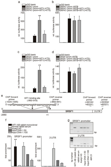 As WT1 represses SRPK1 in podocytes [19], but we observed increases in Srpk1 and Srsf1 in tumor endothelial cells with high Wt1 expression compared to lung endothelial cells and a decrease of Srpk1 and Srsf1 expression upon endothelial-specific knockout of Wt1, we investigated whether Wt1 might be an activator instead of a repressor of Srkp1 and Srsf1 promoter activity in endothelial cells. For this purpose, we transiently co-transfected Srpk1 or Srsf1 promoter constructs [19,28] in the pGl3 basic luciferase reporter vector together with WT1(−KTS) or WT1(+KTS) expression constructs in C166 endothelial cells. These two WT1 variants differ by the presence/absence of three amino acids (KTS) in the zinc finger domain of the molecule. SRPK1 and SRSF1 promoter activity was stimulated by WT1(−KTS). In contrast, WT1(+KTS), which has a role in posttranscriptional RNA processing and pre-mRNA splicing rather than transcriptional regulation [47,48], did not significantly change promoter activities (Figure 6a–d). A SRPK1 promoter construct with deletion of the identified WT1-binding site [19] showed higher basal activity compared to the wild-type promoter construct when transfected in C166 endothelial cells. This might indicate that besides WT1 other transcription factors, which act as repressors bind to this region. Co-transfection of the SRPK1 promoter construct with deletion of the identified binding site [19] with WT1(−KTS) or WT1(+KTS) expression constructs in C166 endothelial cells abolished activation of the promoter construct (Figure 6b). Interestingly, the SRSF1 promoter contained multiple repetitions of known WT1-binding elements (ggagg) (Figure 6e). Deletion of this predicted WT1-binding site in the SRSF1 promoter construct resulted in higher basal activity, but abolished activation by WT1(−KTS) (Figure 6d). As physical interaction of WT1 with the SRPK1 promoter has been shown already [19], we focused for chromatin immunoprecipitation assays (CHIP) only on the SRSF1 locus. We used a rabbit monoclonal antibody against WT1, which confirmed direct binding of WT1 to the SRSF1 promoter, but not to 3′ UTR sequence of SRSF1. An antibody against Acetyl-histone 3 and input DNA served as positive controls and normal rabbit serum as negative control (Figure 6e–g).