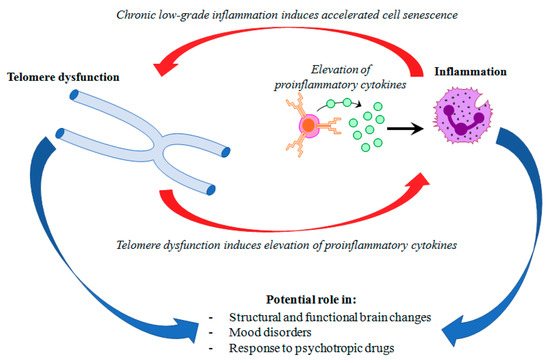 Most of the studies exploring telomere dynamics and inflammatory markers in mood disorders have been so far carried out in peripheral blood. Shorter leukocyte telomere length (LTL), as well as increased levels of circulating pro-inflammatory cytokines, have been reported in mood disorders [6,7,8]. Telomere shortening (TS) is a hallmark of cellular aging, and while telomeres shorten physiologically with each cell division, this shortening rate can be increased by allostatic load and inflammatory insults [9], thus affecting the aging process.