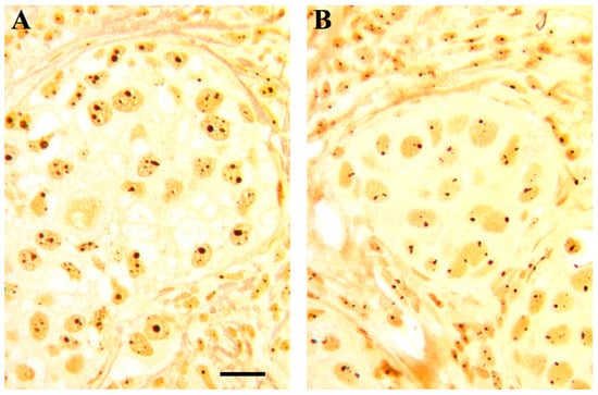 Pathologists had focused on the nucleolus as a parameter for the diagnosis of tumour malignancy since the end of the nineteenth century [], and hypertrophied nucleoli were considered a hallmark of cancer cells. However, whether the size of the nucleolus actually constituted a reliable parameter for distinguishing malignant from benign tumour cells remained undefined for a long time. In 1986, Ploton and colleagues [] succeeded in visualizing the interphase AgNORs by light microscopy in routine paraffin sections by applying a modified, simple silver staining method for the NOR proteins. Using this method, the AgNORs appear as well-defined black dots distributed within the nucleolar body and perfectly identify the structural-functional units of the nucleolus (Figure 2A,B).