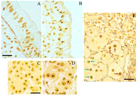 Chronic inflammatory diseases and nucleolar hypertrophy; (A) histological sections from normal human colon and (B) from human colon with ulcerative colitis (UC), after selective silver staining for NOR proteins. The size of nucleoli of the epithelial cells lining the surface of the normal mucosa is smaller than that of the epithelial cell nucleoli in UC. Bar, 10 µm. (C) Histological sections from normal human pancreas and (D) with chronic pancreatitis, after selective silver staining for NOR proteins (courtesy of Dr. M. Macchini, San Raffaele Scientific Institute, Department of Medical Oncology, Milan, Italy). Note the larger size of nucleoli of acinar cells in chronic pancreatitis than in normal pancreatic tissue. Bar, 10 µm; (E) histologic section from a human hepatitis B virus-related cirrhosis after selective silver staining for NOR proteins. Red arrows indicate hepatocytes with hypertrophic nucleoli, which are close to chronic inflammatory infiltrate. Green arrows indicate hepatocytes with normal-sized nucleoli. Bar, 10 µm.