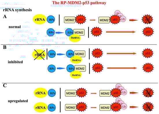 Schematic representation of the RPs-MDM2-p53 pathway showing the relationship between ribosome biogenesis rate and the level of p53 stabilization; (A) in normal conditions, the p53 level within the cell is maintained low because p53 is a short-lived protein that is rapidly degraded by murine double minute 2 (MDM2) and HDM2 in humans. In fact, MDM2 acts as an E3 ubiquitin ligase facilitating p53 proteasomal degradation [,,]. Only a limited amount of MDM2 is inhibited by RPs not used for ribosome biogenesis. Among the RPs binding to MDM2, RPL11-uL5 and RPL5-uL18 play a major role in MDM2 inactivation [,,,] by forming a complex with 5S rRNA, all the components of the complex being necessary for its inhibitory function [,]; (B) perturbations of ribosome biogenesis (for example those caused by the treatment of rRNA transcription or processing inhibitors) are responsible for the fact that rRNAs are no longer available for ribosome construction. Then a greater amount of ribosomal proteins (RPs) is left free bind to MDM2 thus relieving its inhibitory activity toward p53 and allowing p53 to accumulate within the cell nucleus (reviewed in [,]); (C) On the contrary, when an up-regulation of rRNA synthesis occurs, a larger amount of RPs are used for ribosome building, being no longer available for MDM2 inactivation. Consequently, the level of p53 is reduced as result of a greater portion of MDM2 which is left free to induce p53 proteasomal degradation [].