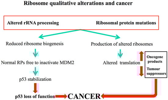 How qualitative alterations of ribosome biogenesis in ribosomopathies may lead to cancer; conditions qualitatively altering ribosome biogenesis include alterations in the rRNA modifying/processing factors and mutations in genes encoding for ribosomal proteins. These conditions (green arrows) can give rise both to a reduced ribosome biogenesis and to the formation of altered ribosomal subunits. Deregulated ribosome biogenesis activates the RP-MDM2-p53 pathway with consequent sustained p53 stabilization. Cells bypass this activation by p53 loss of function. The formation of altered ribosomes leads to unbalanced translation of tumour contrasting and promoting factors. The combined effect of the two different mechanisms would favor cancer onset (red arrows).