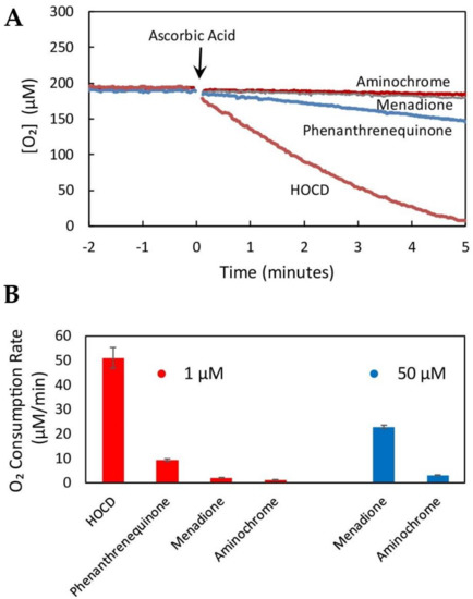 Hypochlorite-oxidized cysteinyl-dopamine (HOCD) undergoes extremely rapid redox cycling. (A) Oxygen consumption mediated by 1 µM concentrations of the indicated redox cyclers following addition of 2.5 mM ascorbic acid (arrow). Oxygen consumption was measured in aqueous solution (0.2 M potassium phosphate, 1 µM EDTA, pH 7.4) at 37 °C. (B) Comparison of redox cycling rates (initial slopes of plots shown in 3A) by 1 µM concentrations of redox cyclers (red bars) or 50 µM concentrations (blue bars). Averages (± standard deviation) of three replicate samples are shown (authors’ unpublished data).