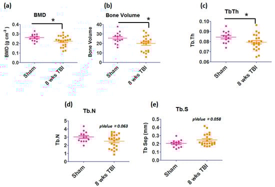 Micro-computed tomography (microCT) was used to measure bone mineral density (BMD), bone volume/total volume (BV/TV), trabecular thickness (TbTh), and trabecular separation (Tb.Sp) in femurs from sham or TBI injured mice. Our data showed significant decreases in bone mineral density (p = 0.0365), bone volume (p = 0.0340), trabecular thickness (p = 0.0521), and trabecular number (p = 0.0630) in TBI mice compared to the controls (Figure 2). Furthermore, we found a trend toward increased (p = 0.058) trabecular separation in TBI mice.