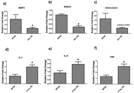 Real-time PCR of bone-related markers and inflammatory genes was performed in bone chips derived from sham or TBI-injured mice at 8 weeks post-injury (Figure 3). All bone related genes showed down-regulation in TBI mice, as compared to sham injured mice. BMP2 (p = 0.05) and RUNX2 (p = 0.001) showed significant down-regulations in 8 weeks TBI bone whereas osteocalcin showed a trend of down-regulation (p = 0.064), as compared to sham (Figure 2c). In parallel to these changes, we observed chronic bone inflammation, as evidenced by increased expression of IL-1 (p = 0.001), IL-6 (p = 0.01), and TNF-α (p = 0.001) in 8 weeks TBI bones, as compared to sham (Figure 3d–f).