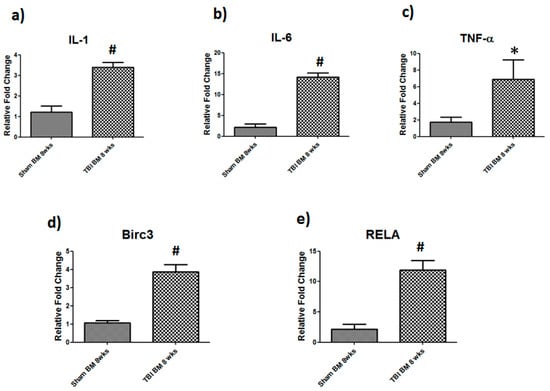 Elevated level of inflammatory and NF-kB signaling genes in TBI bone marrow. TBI mice showed increased mRNA expression of inflammatory genes (a) IL-1, (b) IL-6, (c) TNF-α and NF-kB signaling genes (d) Birc3 (e) RelA/p65 in 8-week TBI bone marrow. After reverse transcription of total RNA, cDNA was amplified by quantitative real-time PCR. Data for each sample were normalized with GAPDH mRNA represented as the fold change in expression compared to sham mouse. Results are means ± SD (n = 6), Significant * p < 0.05, and # p < 0.01 determined by using student’s t-test.
