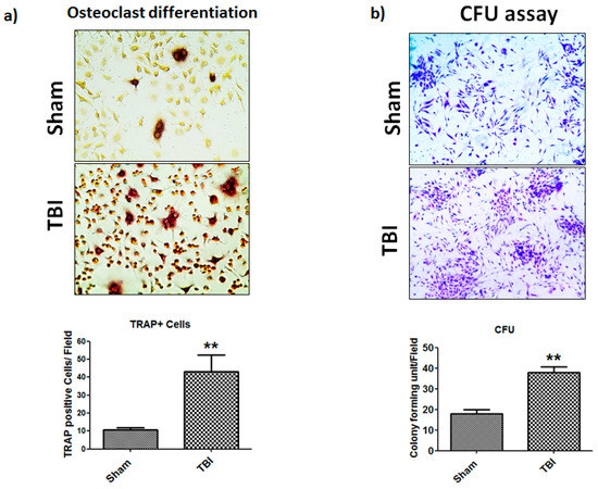 Colony forming cells are one of the important pre-osteoclast cells which differentiate into osteoclasts. Thus, we next hypothesized that the elevated level of bone loss observed by microCT after TBI was due to increased colony forming activity and osteoclast differentiation efficiency by bone marrow cells after TBI. To test this hypothesis, isolated bone marrow cells from sham or TBI mice were cultured in the presence of macrophage colony-stimulating factor (M-CSF) for CFU and osteoclast media for osteoclast differentiation. TBI-derived bone marrow cells exhibited significantly higher (p = 0.01) CFU and cell proliferation efficiency (Figure 5b). The osteoclast differentiation assay also showed similar findings. We found that TBI derived bone marrow cells have significantly (p = 0.01) higher TRAP positive multinucleated cells compared to sham group (Figure 5a).