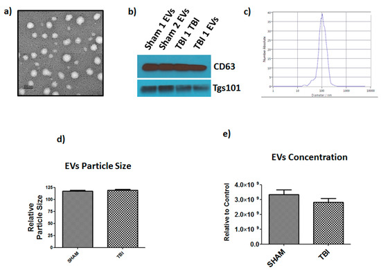 We isolated EVs from sham and TBI mice bone marrow using precipitation and centrifugation method as per our published method [27,28,29]. Electron micrographs showed that the isolated EV particles are round shaped vesicles (Figure 6a) and western blot (Figure 6b) analysis showed band of exosome markers Tsg101, and CD63. Previously, we showed immuno-gold staining for CD-9, and CD-63 on EVs isolated from mouse bone marrow [29]. Nanoparticle tracking analysis showed that vesicles isolated from bone marrow are in the ~100 nm diameter size range, consistent with the known size of EVs [27,28,29]. We did not find any significant changes in size or concentration of bone marrow derived EVs of TBI (Figure 6d).