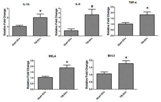 TBI derived bone marrow EVs regulate inflammatory and NF-kB signaling gene expression. Bone marrow cells treated with sham and TBI derived EVs at concentrations of 20 µg/mL for 36 h followed by RT-PCR, IL-1, IL-6II, TNF-a, and RelA/p65 and Birc3 (n = 6, * p < 0.05, # p < 0.01).
