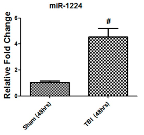 TBI alters the miRNA-1224 content in bone marrow-derived EVs. Real-time PCR showing change in miRNA-1224 expression in 48 h TBI bone marrow-derived EVs cargo (n = 8, # p < 0.001).