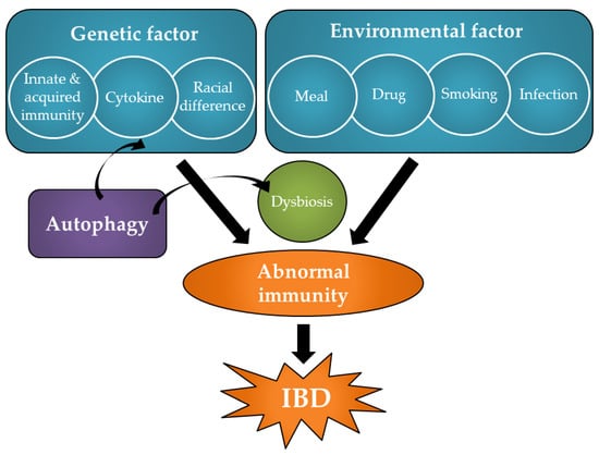 Abnormalities related to genetic predisposition and autophagy are deeply involved in dysbiosis. Representative autophagy-related genes include nucleotide-binding oligomerization domain containing 2 (NOD2), autophagy-related 16 like 1 (ATG16L1), and immunity-related GTPase family M (IRGM) [16,17,18]. Autophagy has been linked to a variety of diseases; however, its link to IBD is currently the subject of much debate.