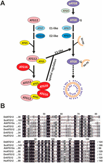 - Matthias, J.; Messling, S.; Eichinger, L. The two dictyostelium autophagy eight proteins, atg8a and atg8b, associate with the autophagosome in succession. Eur. J. Cell Biol. 2016, 95, 15–25. [Google Scholar] [CrossRef]