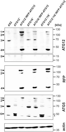 Verification of different mutant strains by immunoblotting of total cell lysates of wild-type AX2, ATG12‾, ATG16‾, and ATG12‾/16‾ cells, and of mutant strains that express RFP fused N-terminally to ATG12. The ATG12~ATG5 conjugate was detected at about 68 kDa in AX2, ATG16‾, and ATG16‾/RFP-ATG12 cell lysates, but not in the ATG12 knock-out strains (arrowhead 3). In knock-out strains expressing RFP-ATG12, the RFP and the ATG12 antibodies detected three bands (arrowheads 1, 2, and 4) and the ATG5 antibody detected two bands (arrowheads 1 and 2). No unconjugated ATG12 of about 14 kDa was detected in AX2 and ATG16‾ cells (arrowhead 5). Unconjugated ATG5 of about 46 kDa was detected in ATG12‾ and ATG12‾/16‾ cells (arrowhead 6). Arrowhead legend: 1 = 115 kDa; 2 = 103 kDa, RFP-ATG12~5; 3 = 68 kDa, ATG12~5; 4 = 46 kDa, RFP-ATG12; 5 = 14 kDa, position of unconjugated ATG12; 6 = 46 kDa, unconjugated ATG5. * = degradation product of ATG5. ATG12, RFP, and actin were visualized on the same membrane. ATG5 immunoblots were performed separately. Actin was used as a loading control. Top rows: ATG12 mAb; upper middle row: RFP pAb; lower middle row: ATG5 pAb; bottom row: actin mAb.