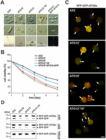 - Messling, S.; Matthias, J.; Xiong, Q.; Fischer, S.; Eichinger, L. The two Dictyostelium discoideum autophagy 8 proteins have distinct autophagic functions. Eur. J. Cell Biol. 2017, 96, 312–324. [Google Scholar] [CrossRef]