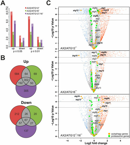 Differentially regulated genes in comparisons of AX2 with ATG12‾, ATG16‾, and ATG12‾/16‾ strains. (A) Percentage of up- and down-regulated genes in dependence of different thresholds for fold change (FC ≥ 2.0, ≤ 0.5) and p-value (p ≤ 0.05, ≤ 0.01) are shown. RNA was isolated from vegetative cells and six biological replicates of each strain were analyzed. Transcriptome: 13,866 transcription units. (B) Venn diagrams of differentially regulated genes of AX2 versus ATG12‾ (left circle, red), AX2 versus ATG16‾ (right circle, green), and AX2 versus ATG12‾/16‾ (lower circle, purple). Differentially regulated genes common for two or three comparisons are shown in grey. Top, up-regulated and bottom, down-regulated genes. Only those genes with fold change ≥2.0 or ≤0.5 and p ≤ 0.05 were used as input. (C) Presentation of differentially regulated genes in a volcano-plot for each strain comparison. Differentially regulated genes with Log2 fold change ≥1 and p ≤ 0.05 are labelled red, genes with Log2 fold change ≤−1 and p ≤ 0.05 are labelled blue, autophagy-related genes are highlighted by bigger orange-filled circles, and proteasome-related genes are highlighted by bigger green-filled circles. For better visualization, all genes with a p-value between 10−5 and 10−6 are randomly distributed in the area from 10−5 to 10−6. All genes with a p-value = 0 (i.e. values < 10−6) are randomly distributed in the area from 10−6 and 10−7. Autophagy genes with a fold change ≥2.0 or ≤ 0.5 and p ≤ 0.05 in at least one of the comparisons are indicated by their Demerec name. The plot was created using the R environment (v. 2.15.0).