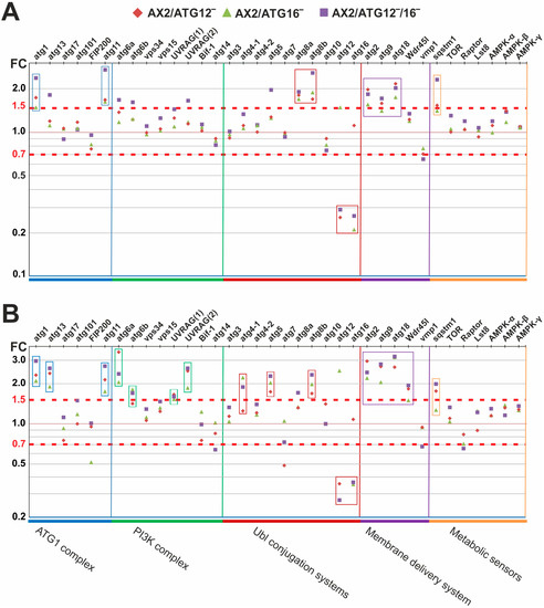 We specifically investigated whether the absence of ATG12, ATG16, or both proteins influences the transcription of other core autophagy genes whose gene products are involved in autophagosome formation. We found that atg1, atg11, atg8a, atg8b, atg2, atg9, and atg18, as well as the autophagy adaptor sqstm1, were up-regulated more than 1.5-fold in at least one of the mutant strains (Figure 5A). As expected, the up-regulation of autophagy-related genes was more pronounced in starved cells (t3) [79] (Figure 5B). In mammalian cells, the up-regulation of core autophagy genes is induced by transcription factors of the FoxO family [80,81]. Taken together, the significant up-regulation of a number of core autophagy genes in the autophagy-deficient mutants indicates the existence of a sensing system for autophagosome formation, which co-ordinately regulates the abundance of the involved ATG proteins [32].