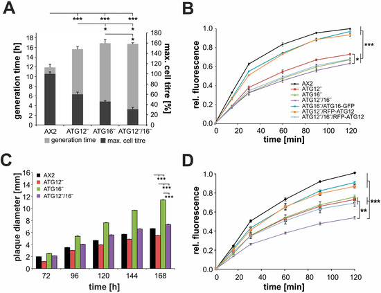 Analysis of endocytosis in AX2 and mutant strains. (A) Generation time and maximal cell titre of AX2, ATG12‾, ATG16‾, and ATG12‾/16‾ cells in shaking culture. The p-values refer to the difference in maximal cell titre. (B) Macropinocytosis of TRITC-labelled dextran. The analyzed Dictyostelium strains were adjusted to 6 × 106 cells/mL and TRITC-dextran was added at a final concentration of 2 mg/mL. Macropinocytosis was measured as relative fluorescence for 2 h at the indicated time points. The final fluorescence of AX2 was set to 1. (C) Growth of AX2, ATG12‾, ATG16‾, and ATG12‾/16‾ cells on a lawn of K. aerogenes. Plaque diameters were quantified every 24 h from day 3 until day 7 after plating of D. discoideum cells. Mean values and SEM of 100 plaques are depicted. For statistical analysis the Dunn-Bonferroni test, implemented in R as post hoc analysis, was performed. Statistical significance between AX2 and the different knock-out strains is depicted for the 168 h time point. (D) Phagocytosis of TRITC-labelled yeast is impaired in mutant strains. Cells were resuspended at 4 × 106 cells/mL in Soerensen’s phosphate buffer and fluorescent yeast cells were added in a six-fold excess. Phagocytosis was determined as relative fluorescence for 2 h at different time points. The final fluorescence of AX2 was set to 1. The same color code as in (B) was used. For statistical analysis in A, B, and D Tukey’s test, implemented in R, was used as post hoc analysis, and mean values and SEM of three independent experiments were calculated. *** p ≤ 0.001; ** p ≤ 0.01; * p ≤ 0.05.