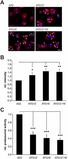 Autophagy and the ubiquitin-proteasome system (UPS) are both critical pathways for protein degradation in eukaryotic cells and are thus mainly responsible for protein homeostasis. In addition, there is increasing evidence for crosstalk between both systems [30,32,66,67,68,69]. First, we conducted confocal microscopy of fixed cells which had been stained with the P4D1 anti-ubiquitin antibody. In comparison to AX2 cells, we detected many large ubiquitin-positive protein aggregates in ATG12‾, ATG16‾, and ATG12‾/16‾ cells (Figure 7A). Next, we examined the level of ubiquitinated proteins in total cell lysates of AX2 wild-type, ATG12‾, ATG16‾, and ATG12‾/16‾ cells. Quantification of Western blots revealed increases of 26%, 46%, and 43% in the amount of ubiquitinated proteins for ATG12‾, ATG16‾, and ATG12‾/16‾ cells, respectively (Figure 7B and Figure S5A).