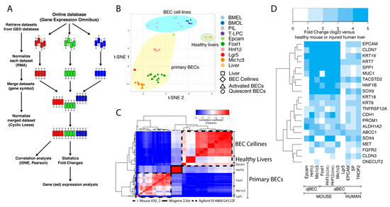 Workflow and clustering of BEC transcriptome data sets. (A) Schematic overview of the workflow to merge microarray data from different platforms. Colored bars represent boxplots of the expression of all genes from one sample. Three colors are an example of three different datasets with multiple samples. (B,C) T-distributed stochastic neighbor embedding (t-SNE) and Pearson correlation analysis of mouse transcriptomic data from BEC cell lines, primary BECs and healthy livers. (D) Relative gene expression analysis (fold change, log2) of common BEC markers in primary human and mouse BECs compared to livers.