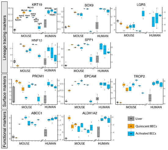 Gene expression of popularly used BEC markers for isolation in primary human and mouse BECs. Gene expression of mouse and human livers (grey), quiescent (orange) and activated (blue) BECs. Left axis represents normalized intensity values (log2) for all mouse gene expression and right axis normalized transcript per million (log2) for human data.