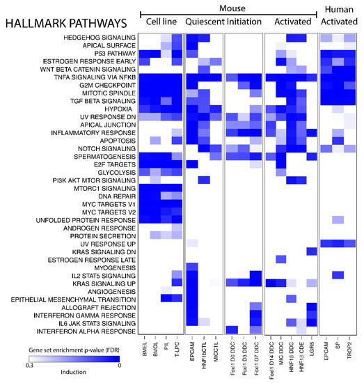 Pathway analysis of BEC populations. Gene set enrichment analysis of Hallmark pathways on transcriptomic profiles of BECs compared to healthy (mouse) or injured (human) livers. Gradient of the blue color represents positively enriched pathway (False discovery rate, FDR).