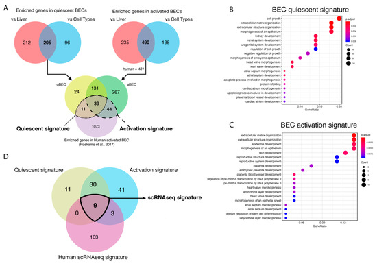 Generation of BEC gene signatures. (A) Venn diagrams of the genes enriched in BECs compared to healthy livers or different cell types and both merged gene sets compared to genes enriched in human BECs. Gene ontology (GO) analysis of quiescent (B) and activated (C) BEC gene signature. The size of the circle is correlated to the number of genes involved in that GO. The color of the circle represents significance (adjusted p-value) and the x-axis stands for gene ratio (genes within signature versus total number of genes in GO). (D) Venn diagram of genes enriched in quiescent and activated BECs (microarray/RNAseq) and in BECs from scRNAseq of human livers.