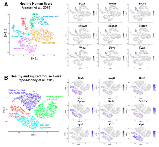 The following are available online at https://www.mdpi.com/2073-4409/8/10/1117/s1, Figure S1 TSNE plots displaying expression of genes and gene signatures from scRNA seq data of Pepe-Mooney et al., 2019. Figure S2 TSNE plots of scRNAseq data of different cell types isolated from healthy human livers from Aizarani et al., 2019. Figure S3 Immunohistochemistry staining of new potential BEC markers from our BEC signature, obtained from protein atlas. Figure S4 Gene expression of genes in the scBEC signature on transcriptomic data of NASH, ASH, Cirrhosis and PSC. Table S1 BEC labeling based on injury model. Table S2 List of genes expressed by only human or mouse BECs.
