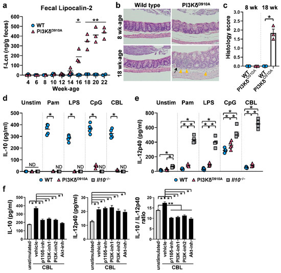 Inflammatory or regulatory phenotypes are determined by PI3Kδ signaling. (a) The time course of concentrations of fecal lipocalin-2 (f-Lcn) from wild-type (WT) and PI3KδD910A mice. (b) Representative images of H&E-stained cecal samples from C57BL/6 wild-type mice (WT) or PI3Kp110δD910A/D910A mice (PI3KδD910A) at 8 and 18 weeks of age. The scale bars represent 100 µm. Black arrow indicates crypt hyperplasia. Yellow arrowhead indicates infiltration of neutrophils and lymphocytes. (c) Histology scores of WT or PI3KδD910A mice at 8 and 18 weeks of age are shown. (d,e) 1 × 106 unfractionated mesenteric lymph node (MLN) cells from WT, PI3KδD910A or IL-10-deficient (Il10−/−) mice were cultured with medium alone (unstim), Pam3CSK4 (Pam, 100 ng/mL), lipopolysaccharide (LPS, 200 ng/mL), CpG-DNA (CpG, 500 nM) or cecal bacterial lysate (CBL, 10 µg/mL) in complete medium for 24 h at 37 °C with 5% CO2. Supernatant levels of (d) IL-10 and (e) IL-12p40 were quantified by ELISA. (f) 1 × 106 unfractionated cLP from WT mice were cultured with or without CBL (10 µg/ml) in the absence or presence of specific PI3K/AKT-related inhibitors or vehicle control in complete medium for 24 h. IL-10 and IL-12p40 levels in cell culture supernatants were measured by ELISA and IL-10/IL-12p40 ratios were calculated. PI3K/Akt-related inhibitors: PI3Kp110δ-selective inhibitor (p110δ-inh, IC87114, 2 µM), PI3K-global inhibitors (PI3K-inh1: LY294002, 2 µM and PI3K-inh2: wortmannin, 0.5 µM); Akt inhibitor (Akt-inh, API-2, 0.5 µM). Vehicle control: dimethyl sulfoxide. N = 4-5/group. Each symbol represents the result from individual mice and bars indicate the mean in a,d–e. Mean ± SEM are shown in c,f. Mann–Whitney unpaired two-tailed test was used for a,c. Dunn’s multiple comparisons test following one-way ANOVA was used for d–f. *p < 0.05, **p < 0.01. ND indicates not detected.
