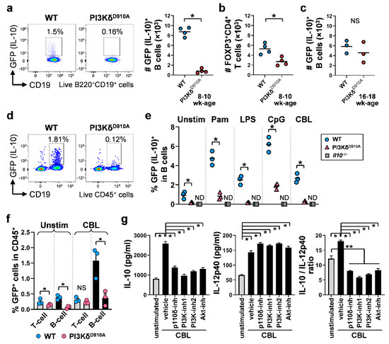 The following are available online at https://www.mdpi.com/2073-4409/8/10/1121/s1, Figure S1: B cell population is significantly reduced in PI3KδD910A mice, Figure S2: The inflammatory or regulatory phenotypes of MLN and spleen cells are determined by PI3Kδ signaling, Figure S3: The median fluorescence intensities of GFP in T cells and B cells, Figure S4: Phenotypic characteristics of B cells in PI3KδD910A mice, Figure S5: Blockade of IL-10 signaling increases IL-12p40 secretion by B cells, Table S1: Antibodies used in the present study.