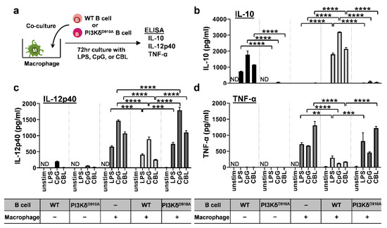 3.3. Bacteria-Stimulated PI3KδD910A B Cells Do Not Suppress Pro-Inflammatory Cytokine Secretion by Macrophages