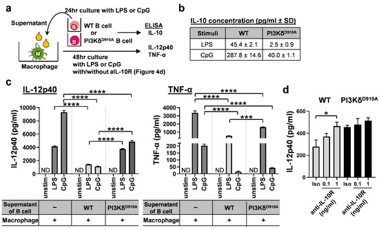 We next sought to determine the mechanisms of WT B cells’ anti-inflammatory effects. Although humoral factors, especially secreted IL-10, are a key mediator of regulatory B cell activity direct cell-to-cell contact can also mediate B cells regulatory function [45,46]. Thus, we evaluated which factor is more predominantly involved in the bacteria-stimulated regulatory activity in B cells against inflammatory macrophages. To explore these possibilities, murine bone marrow-derived macrophages were cultured in the supernatants (excluding cells) from bacterial product-stimulated WT or PI3KδD910A B cells (Figure 4a). As expected, IL-10 levels in PI3KδD910A B cell supernatants were lower than those in WT B cell supernatants (Figure 4b). Pro-inflammatory IL-12p40 and TNF-α produced by the macrophages were significantly decreased with the supernatants from WT B cells, but only partially suppressed by the supernatants from PI3KδD910A B cells (Figure 4c). Blockade of IL-10 signaling by anti-IL-10 receptor antibody negated the regulatory effect of the supernatant from WT B cells, indicating that the anti-inflammatory effect was primarily mediated by IL-10 (Figure 4d). These results suggest that incomplete suppression by the PI3KδD910A B cell supernatant is primarily due to lower IL-10 concentrations. Moreover, as secreted IL-10 also affects B cells [45], we blocked IL-10 receptor on B cells to observe autocrine effect of IL-10. Interestingly, IL-10R blockade significantly increased IL-12p40 secretion in a dose-dependent manner in CpG-stimulated B cells (Figure S5). This finding indicates that low levels of IL-10 secretion from PI3KδD910A B cells influence not only other surrounding cells but also the B cell responsiveness to bacterial stimuli. PI3Kδ signaling appears to modulate B cell phenotype both directly (by regulating TLR signaling) and indirectly (through an IL-10 autocrine pathway).