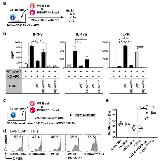 PI3Kδ-signaling in B cells regulates bacteria-stimulated inflammatory cytokine production by and proliferation of T cells. (a,b) 5 × 105 WT splenic naïve CD4+ T cells plus 2 × 105 Il10−/−; Rag2−/− antigen-presenting cells (APC) were co-cultured with or without 1 × 106 splenic B cells in the presence of 10 µg/mL CBL for 72 h. Supernatant levels of IL-10, IFN-γ and IL-17a were measured by ELISA in duplicates. N = 4–6/group. (c–e) The 5 × 105 CFSE-labeled WT naïve CD4+ T cells were cultured with 1 × 106 B cells from WT or PI3KδD910A mice for 72 h with CBL (10 μg/mL). After culturing, single cells were stained and proliferation of naïve CD4+ T cells were assessed by flow cytometry. Representative histograms of live CD4+ T cells (Live/DeadnegCD45+TCRβ+CD3+CD4+CD8neg) are shown in d. Percentage of proliferating cells was demonstrated in e. Bars indicate the mean. Dunn’s multiple comparisons test following one-way ANOVA was used for b,e. *p < 0.05, **p < 0.01, ***p < 0.001, ****p < 0.0001. ND indicates not detected.