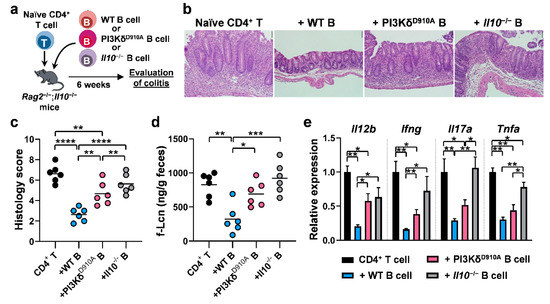 Recipient Il10−/−; Rag2−/− double-deficient mice were injected intraperitoneally with 5 × 105 splenic naïve CD4+ T cells isolated from WT mice along with or without 1 × 106 splenic B cells from WT, PI3KδD910A or Il10−/− donors. Six weeks after cell transfer, mice were sacrificed and colitis severity was evaluated by fecal lipocalin-2, histology scoring, and gene expression of proinflammatory cytokines in tissues.