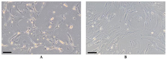 Morphology of liver MSCs isolated from liver of patients with fibrosis. A—liver MSCs 5 days after isolation; B—liver MSCs at 11 passages. Bar scales: 25 µm.