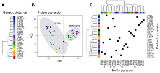 Biofilm and planktonic proteomes could be clearly separated by principal component analysis (PCA) (Figure 1B), indicating that there were profound differences in protein abundances under these conditions, which were shared by the isolates. Although the 27 clinical P. aeruginosaisolates originated from diverse genetic backgrounds, they presented very similar proteomic profiles under planktonic conditions. In contrast, the biofilm proteome profiles were much more divergent between the strains. We also found that two isolates that clustered more closely under planktonic growth conditions did not necessarily cluster to the same extent, if grown in biofilms and vice versa (Figure 1C). Furthermore, there was no correlation between phylogenetic relatedness and the production of specific proteomic profiles, indicating that strains from any genetic background can produce distinct environment-driven proteome profiles. In conclusion, the 27 clinical isolates produced a higher proteome diversity when cultivated under biofilm conditions and this divergent protein profile was independent on the genetic background of the isolates and was not linked to the protein profile that was produced under planktonic growth conditions.