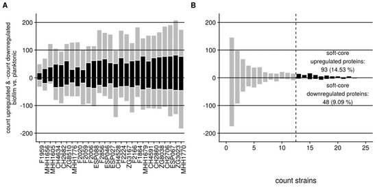 Differential protein expression between biofilm and planktonic growth conditions across 27 clinical isolates. (A) Number of proteins, which are up- and down-regulated in biofilm as compared to planktonic growth conditions, are shown for each strain. The number of proteins that belong to the set of soft-core biofilm proteins are colored black. Soft-core biofilm proteins are defined as those proteins, which exhibit an average expression level difference in all clinical biofilm grown isolates as compared to planktonic cultures and are found differentially expressed in at least 50% of the isolates. (B) Number of proteins that are commonly found differentially expressed in 1,2,3…27 isolates. No protein was found to be regulated in all of the analyzed (27) strains. The number of proteins that belong to the set of soft-core biofilm proteins are highlighted in black.