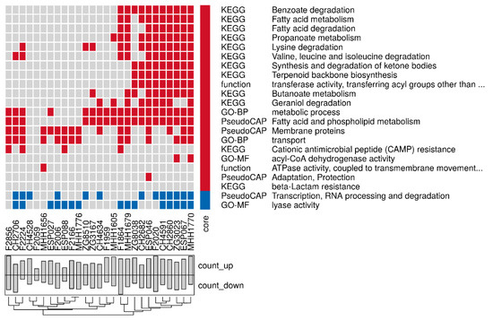 Enrichment of functional categories in the soft-core biofilm protein profile.All functional categories that were enriched (p-value < 0.05) in the group of proteins with a differential expression under biofilm as compared to planktonic growth conditions in at least 50% of the clinical isolates are listed. Function that were enriched in proteins that were up-regulated under biofilm condition in the individual isolates (x-axes) are colored in red, functions that were down-regulated are in blue. Bar plots indicate how many proteins were up and down-regulated in the individual strains. Functions were derived from KEGG-, PseudoCAP- or gene ontology (GO)-annotations. GO-MF = molecular function, GO-BP = biological process, GO-CC = cellular component.