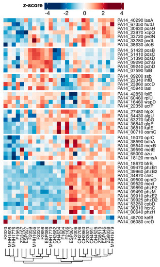 In order to evaluate the variability of protein expression across the isolates when P. aeruginosa strains were cultured under the same environmental condition, we analyzed the 10% most variably expressed proteins within biofilm and planktonic growth conditions. 40% of the highly variable proteins overlapped under biofilm and planktonic conditions (Figure A2), indicating that those proteins were variably expressed between strains independent of the environmental conditions. Figure 4 shows a heatmap of the 48 most variably expressed and annotated proteins under biofilm conditions. Despite their variant expression across the 27 isolates, it seemed that there were sub-groups of isolates, which expressed groups of proteins at comparable levels. For instance, six isolates with various phylogenetic background expressed high levels of PqsBSD and PchDG compared to the other isolates, whereas eleven isolates expressed high levels of seven Phz proteins, as well as OpmD and MexI.