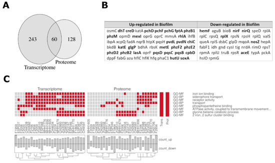Figure 5B,C depict the genes/proteins and the corresponding functional groups, which were enriched in the proteome and transcriptome biofilm profiles across the 27 isolates (Figure A3). Especially iron-related and transport-functions were found.