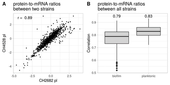 Protein-to-mRNA ratios across clinical P. aeruginosa isolates. (A) Exemplary plot of protein-to-mRNA correlation between two strains under planktonic condition. r = Pearson correlation (B) Median and interquartile range of the pair-wise correlation coefficients of all protein-to-mRNA ratios of the 27 strains under biofilm and planktonic conditions. Values on top of the boxplots represent the corresponding median.