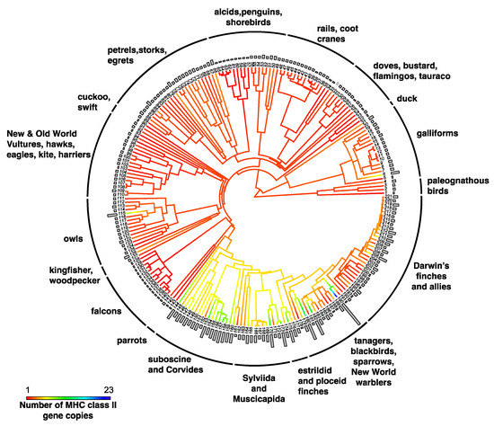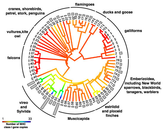 Ancestral character estimation of gene copy number at MHC class IIB genes along the branches and nodes of a tree for birds. Bars associated with each terminal node indicate the estimated number of MHC gene copies. Figure modified from Minias et al. 2018 [103]. Key to species names is supplied in Supplementary Table S1.