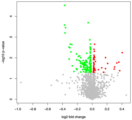 Volcano plot for the differentially expressed miRNAs in COPD patients surviving a 54-month period versus patients who died within this period. Significant miRNAs are indicated in red (overexpressed in surviving patients) or green (reduced expression in surviving patients).