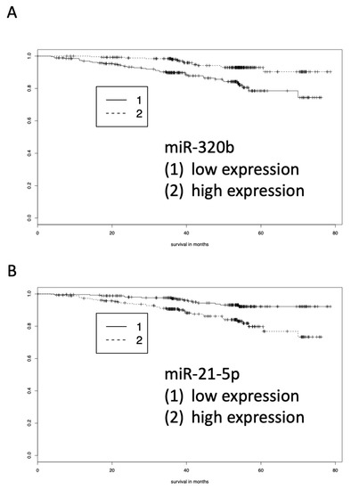 While the above analysis focused on the abundance of blood-born miRNAs in the two patient groups, we also analyzed miRNAs for their correlation with 54 months survival. Using Kaplan-Meier estimators, six miRNAs (miR-21-5p (negative correlation with survival), miR-320b (positive correlation with survival), miR-3123 (negative correlation with survival), miR-4264 (positive correlation with survival), miR-4782-5p (positive correlation with survival), and miR-4792 (negative correlation with survival)) were identified that were significantly correlated with survival time within the 54-month period. These included miRNAs with both increased and decreased abundances, each of them associated with prolonged survival. Figure 3A,B show two examples of a miRNA with high expression (miR-320b) and a miRNA with low expression (miR-21-5p) in patients with longer survival.