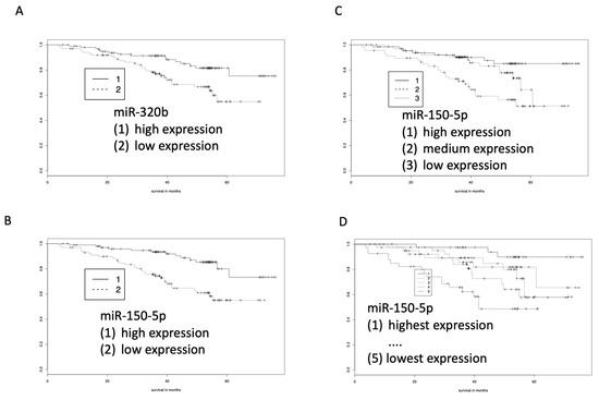 A partitioning of the patients in different numbers of subgroups, ranging from a group with highest expression to a group with lowest expression, led to even more clear-cut findings. For example, using three groups of miR-150-5p expression survival was longest in patients with highest expression and lowest in patients with lowest expression (Figure 4C). Likewise, splitting into five groups, i.e., quintiles, showed that the miR-150-5p expression was highly correlated with survival. While 90% of patients with the highest expression of miR-150-5p survived the 54-month follow-up, only 50% of patients with lowest expression of this miRNA survived the same period. Regarding miR-320b, about 60% of patients with low abundance survived the 54-month period, in contrast to about 80% of patients with high abundance.