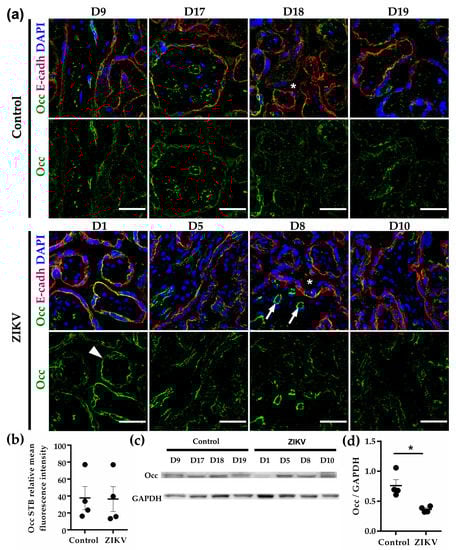 3.8. Occludin Expression in the STB was Low and not Affected by ZIKV Infection