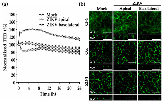 Miranda, J.; Martín-Tapia, D.; Valdespino-Vázquez, Y.; Alarcón, L.; Espejel-Nuñez, A.; Guzmán-Huerta, M.; Muñoz-Medina, J.E.; Shibayama, M.; Chávez-Munguía, B.; Estrada-Gutiérrez, G.; et al. Syncytiotrophoblast of Placentae from Women with Zika Virus Infection Has Altered Tight Junction Protein Expression and Increased Paracellular Permeability. Cells 2019, 8, 1174. https://doi.org/10.3390/cells8101174
